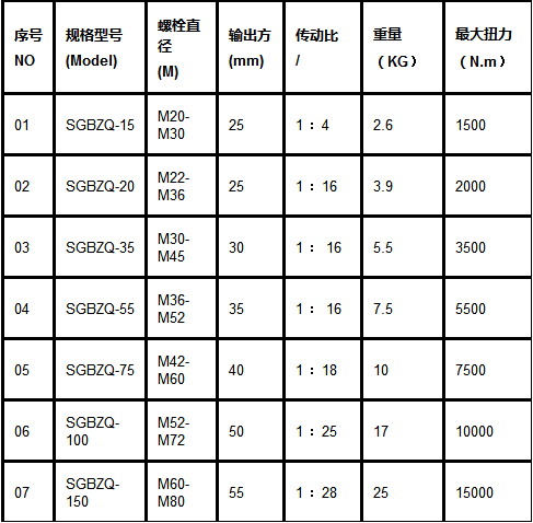 采用*行星變速結(jié)構(gòu)作為主傳動(dòng),體積小,重量輕,由于變速比大,輸入較小力量就能產(chǎn)生很大的輸出扭矩,反作用支腳可360°任意調(diào)換位置,操作人員只需要施加很小的力,既可得到5-40倍的輸出力距,配套扭力扳手根據(jù)傳動(dòng)比預(yù)置好扭力,達(dá)到相應(yīng)預(yù)緊扭矩,能自動(dòng)發(fā)出訊號(hào)““嗒””的一聲報(bào)警,同時(shí)伴有明顯的手感振動(dòng),從而輕捷的完成螺栓螺母的緊固拆卸工作